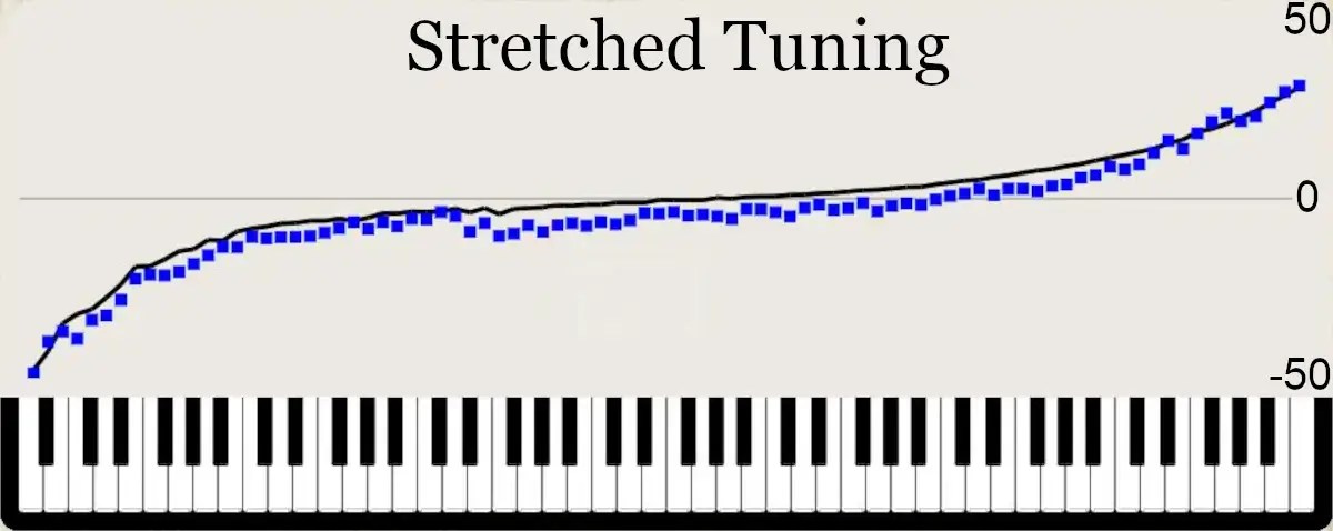 Real piano tuning software needs to be able to calculate a custom tuning for your piano based on measurements of the piano’s tone. Below is a “Railsback curve” graph showing what a custom “stretched” tuning looks like (dark black line with the blue dots) versus a generic tuning app would target (the gray horizontal line).