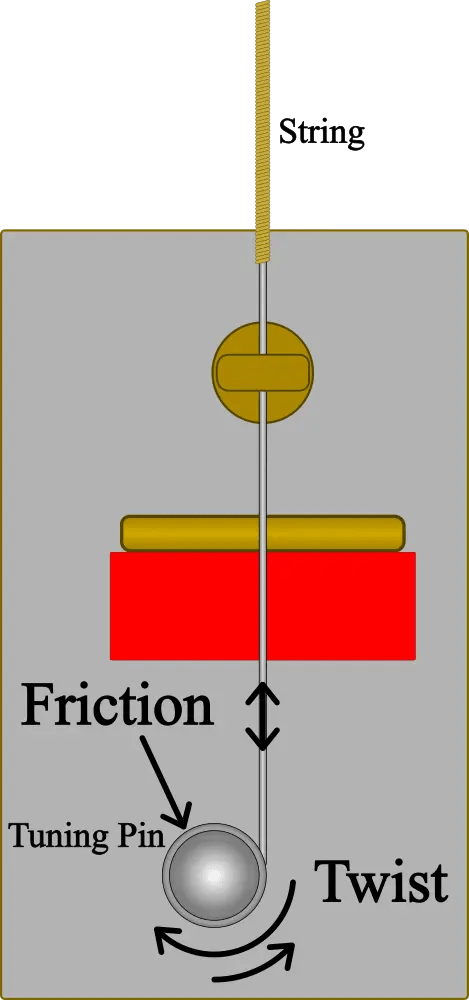 In the above sections we briefly mentioned the friction of the tuning pin turning in the pin block and the string sliding along the contact points between the tuning pin and the speaking length. In this section, we’re going to learn how that friction affects tuning stability.