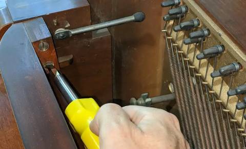 - On older pianos, you might have to disassemble the left side more to get it out. If there is a return spring pulling up and a pedal rod pulling down, you may have to remove both the spring and the pedal rod and pop the arms of the mechanism out of the holes on the left and right sides of the piano.